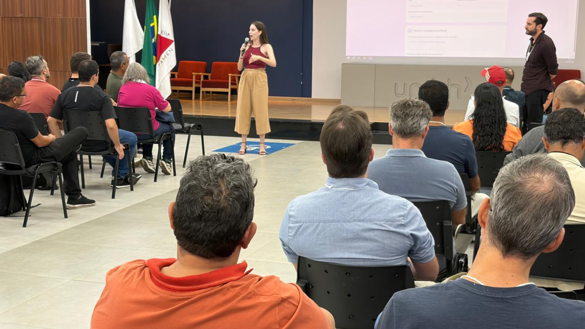 A superintendente da Escola de Formação, Gabriela Hoffer, apresentou a programação formativa prevista para os três dias do encontro, com atividades voltadas ao uso de inteligência artificial e de tecnologias pedagógicas. Durante a apresentação, explicou a proposta do momento de escuta, voltado à coleta de demandas e pontos de atenção apresentados pelos Núcleos de Tecnologia Educacional.
