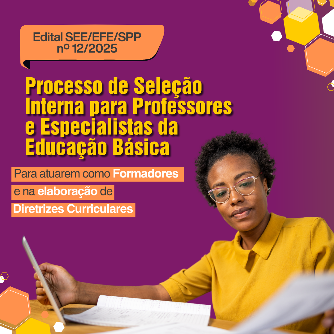 A Secretaria de Estado de Educação de Minas Gerais informa a abertura do Edital SEE/EFE/SPP nº 12/2025, que institui o Processo de Seleção Interna (PSI) destinado à escolha de Professores Formadores e Professores Elaboradores de Diretrizes Curriculares para a Educação Básica do Estado de Minas Gerais.